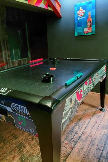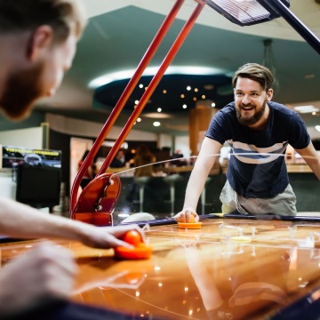 Air Hockey je stolní hra, kde puk klouže po vzduchem nadlehčovaném povrchu, což mu umožňuje vysokou rychlost a hladký pohyb.